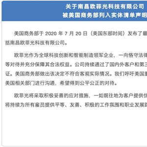 7月22日晚间,欧菲光通过官方微信平台发布声明称,美国商务部于2020年7月20日(美国东部时间)发布了最新的“实体清单”,其中包括南昌欧菲光科技有限公司。
