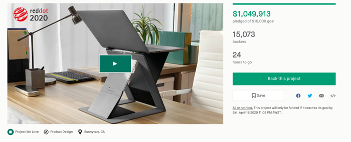 这款笔记本电脑支架,之前在全球知名的众筹平台Kickstarter上完成众筹,短短1个月就得到1.5万人支持,筹得100万美金。