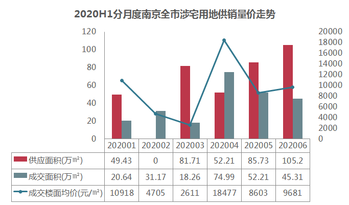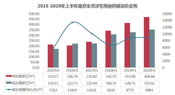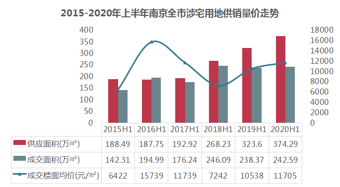 2020H1南京全市涉宅用地供应64幅、374.29万方,居近6年新高;