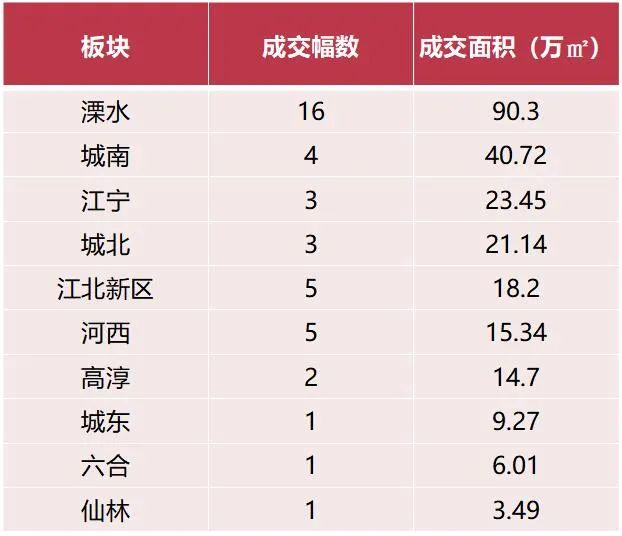 分板块看,成交集中在溧水、城南、江宁和城北,但溧水成交地块中安置房地块占比较高。