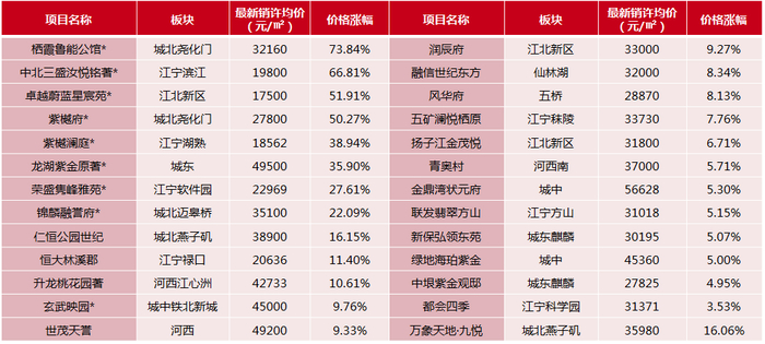 注:带*的为纯新盘,计算价格涨幅采用的是区域内最后开盘项目的价格。