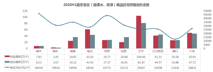 2020H1供应前四板块为:江宁、城北、六合、江北新区,四板块供应占全市(除溧水、高淳)供应总量的70%;成交前三区域为江宁、六合、江北新区和城北,四板块成交占全市(除溧水、高淳)成交总量的61%。