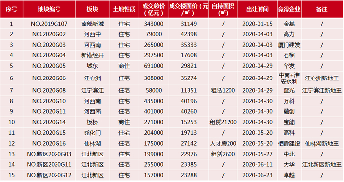 2020H1南京全市经营性用地成交41幅、3242.59万方,居近6年第二高;