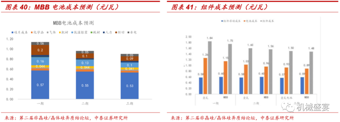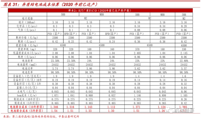 ③异质结电池及组件成本:公司将于2022年投产的三期,电池成本有望降低至0.811元/瓦(含税成本),具体测算条件如下:①硅片158.75方单晶,厚度为160μm-150μm-140μm,价格基于当前;②靶材基于国产,一期基于RPD,二期与三期基于PVD+RPD;③低温银浆售价6000-5500-4800元/kg;④MBB电池效率24%-24.3%-24.5%;⑤良率98.5%-98.8%-99%;⑥公司5GW超高效率HJT太阳能电池及5GW高效组件项目分三期进行投产,其中一期220MW于2020年10月底投产(来源:第二届非晶硅和晶体硅异质结(HAC)光伏发展与国产化论坛)。此外,三期叠瓦电池组件成本有望降低至1.50元/瓦,MBB电池组件成本有望降低至1.48元/瓦。
