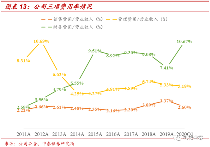 公司有息负债减少,财务费用水平降低。2019年,公司管理费用率为5.33%,同比下降0.41pct;销售费用率为3.37%,同比增长0.48pct;财务费用率为7.41%,同比下降1.67pct,公司有息负债减少,整体财务费用率有所下降。