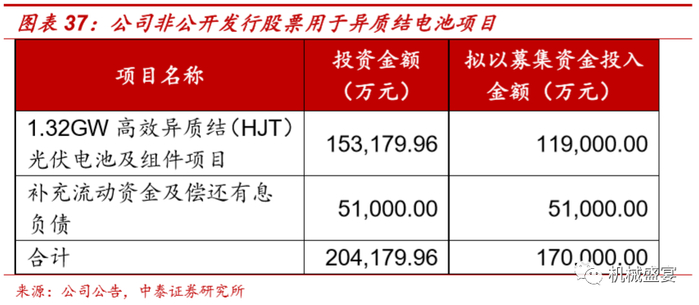 异质结电池及组件规模:公司位于浙江省长兴县的5GW超高效率HJT太阳能电池及5GW高效组件项目,将分三期进行投产,采用国际顶级先进半导体设备。一期实现年产1.8GW高效异质结(HJT)光伏电池及1.8GW高效组件的制造。目前一期项目进展及计划:2019年3月正式动工,11月底主体厂房竣工;12月底开始水电气废水等动力配套设施建设;4月初开展一期组件一号线调试,当月投产。HJT电池一期220MW预计2020年9月开始电池安装调试,预计2020年10月底投产。并且公司已经披露了非公开发行股份募集资金用于投资“1.32GW高效异质结(HJT)光伏电池及组件项目”,项目按总体规划分期分阶段实施,预计2022年1月全部建设完成。