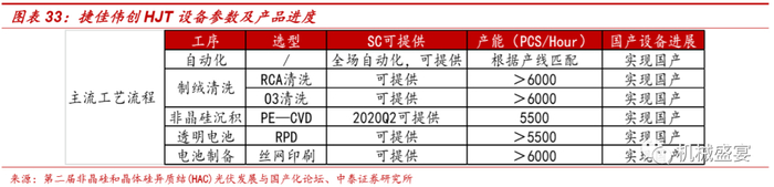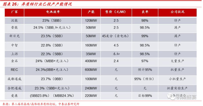 产业方面:目前已投产的HJT仍以百兆瓦级别为主,前期设备主要以进口为主,单GW投资在15-18亿(2016-18年),由于工艺简单,良率基本上能做到98%以上。转换效率根据各家采取的组件工艺有所不同,一般在23%(5BB,5主栅)、23.5%(MBB,多主栅;或0BB,无主栅,如SWCT)。