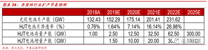 异质结行业扩产节奏测算:①考虑到下游装机需求,假设2019-2022年全球光伏电池片产能年均增速为15%;②基于上文中的已有产能规划,2019年HJT预计扩产计划1.5GW;参考PERC产能在2016-2018年新增10GW、20GW、30GW,假设2020Q3异质结设备降本及银浆国产化进度如预期,即到2020Q3年异质结将迎来第一波扩产高潮,假设2020-2022年HJT新增产能为10GW、20GW、30GW(新增产能对应设备订单,不代表当年即达产)。③长期来看,我们预计2025年异质结扩产高点将达到100GW。一方面,参考2019年PERC扩产达到45GW,考虑到异质结技术落地有望带来光伏平价上网,假设2025年HJT产能扩产有望达到100GW。另一方面,受平价上网助推,2025年全球光伏新增装机容量需求有望达到3-500GW,异质结设备的更新周期为3-5年左右,基于此测算,在不考虑额外的新技术冲击下,异质结产业成熟下的存量更新需求为年均100GW。