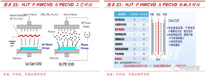非晶硅沉积工艺:主要指用CVD的方式来镀本征非晶硅层、P型非晶硅层、N型非晶硅层,该步骤是实现异质结结构的关键,也是通过镀膜工艺取代了传统PERC工艺中的扩散工艺。目前主要两种方式:HWCVD(热丝化学气相沉积)和PECVD。日本松下采取的是HWCVD的方式。总体来看现行的技术方向是PECVD,尤其是VHFPECVD(高频等离子体化学气相沉积)也有望需求持续增长。该工艺涉及到的设备主要是HWCVD以及PECVD。