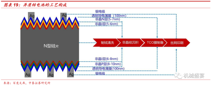 异质结电池制造包括四大工艺。相比于PERC电池,HIT电池在制备过程对清洁度要求更高,需要对设备和车间做到更高程度的洁净度,因此不能与传统电池的生产车间兼容。HIT电池制备的4道工艺及设备分别为:①制绒清洗。该工艺涉及到的设备主要是湿式化学清洗设备;②非晶硅沉积。该工艺涉及到的设备主要是HWCVD以及PECVD;③透明导电膜制备。该工艺涉及到的设备主要是RPD以及PECVD;④丝网印刷。由于丝印工艺变动不大,我们着重在后文中介绍前三类工艺。