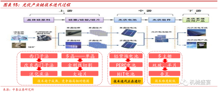 光伏产业链可分为硅料、硅片、电池片、组件、地面电站五个环节。硅料、硅片等基础产品的生产制造属于光伏产业上游,光伏电池片和组件等关键产品属于产业链中游,光伏发电系统和应用产品属于下游环节。硅料和硅片端的工艺和设备均已较为成熟,新的技术尚未取得突破,而电池片和组件正处于技术迭代进程之中。其中,在电池片环节,2016年至今处于第2代PERC替代第1代铝背场时期,后期将向第3代HIT方向发展。