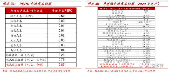 电池端:从产业链应用角度来看,虽然异质结技术发生在电池端,但是最终买单的是终端的电站企业,因此组件性价比的测算是关键。经测算,常规单晶PERC的成本为0.83元/W(含税)。目前已达产的异质结电池成本在1.3-1.5元/W左右(含税,5年折旧测算),将于2020年达产的异质结电池成本在1.06元/W(含税,5年折旧测算)。