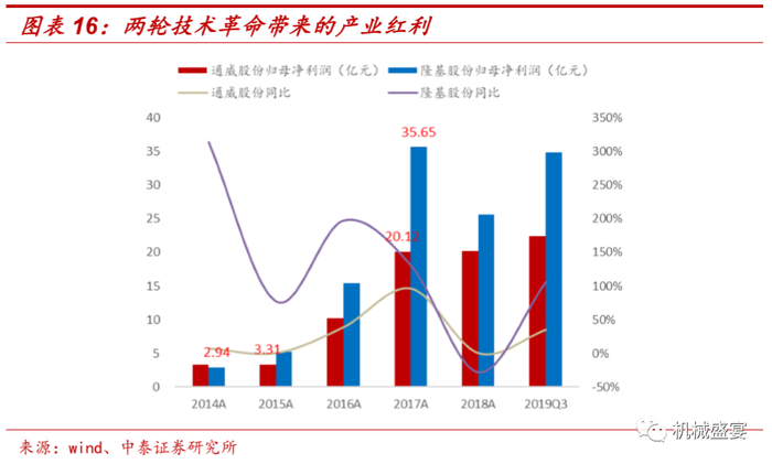光伏电池片技术革命将孕育巨大产业机会。后PERC时代,“PERC+”、“HJT”均有可能。“PERC+”是指PERC的基础上进行持续的工艺改进,优势是能够实现与原有产线的良好兼容,更容易实现产业化主要包括SE、双面、N-PERT、TOPCon等;HJT是对PERC工艺进行了颠覆,无法进行兼容,代表行业下一代技术的发展方向。回顾上一次多晶代替单晶时,催生了隆基和通威两大行业巨头,其带来的产业红利见下图: