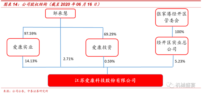 公司实际控制人为邹承慧,公司控股股东为邹承慧及其控制的江苏爱康实业集团有限公司(简称“爱康实业”)和江阴爱康投资有限公司(简称“爱康投资”),截至2020年06月16日,邹承慧、爱康实业及爱康投资分别持有公司2.71%、14.13%、0.59%的股份。除邹承慧(含其控制的主体)及张家港经济开发区实业总公司以外,公司没有其他持股5%以上的股东,股权相对集中。此外,公司于2018年度实施了股权激励计划,解禁条件为净利润增长率达到目标值。股权激励计划的实施有利于保持员工稳定性,员工激励与公司业绩的绑定也有利于公司进一步的发展。