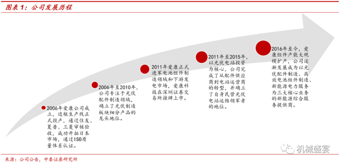 ①公司成立于2006年,同年边框生产线正式投产,通过住友、夏普、三菱审核验收,成功开拓日本市场;2006年至2010年,公司专注于光伏配件制造领域,确立了光伏制造板块细分产品的龙头地位,成功开拓欧美等市场;2011年至2015年,公司完成了从配件供应商到电站运营商的转型,并确立了民营光伏电站运维领军者地位;2016年至今爱康电池组件产能大规模扩产,公司逐渐发展成为以光伏配件制造、高效电池组件制造、新能源电力服务为三大核心业务的新能源综合服务提供商。