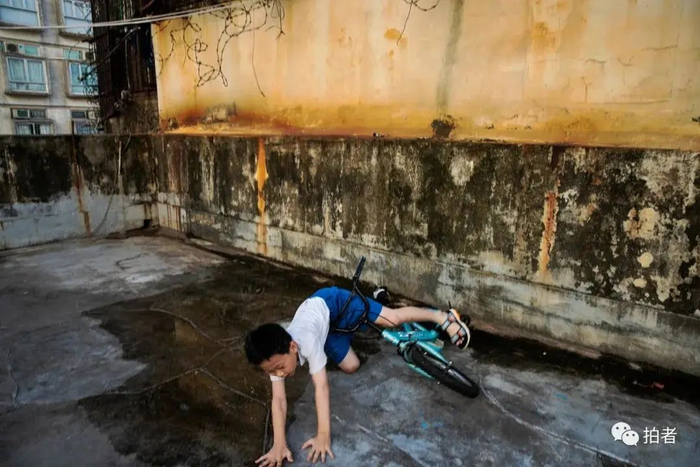 ▲放学后,好动的黄凤儿子在天台上骑自行车,不小心摔倒了。