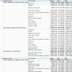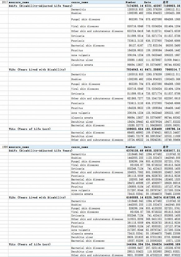 根据世界银行数据GBD2017的数据报告中,对比1990年及2017年皮肤疾病负担后发现,斑秃的伤残调整寿命年(DALY)、过早死亡损失寿命年(YLL)都排在前列。