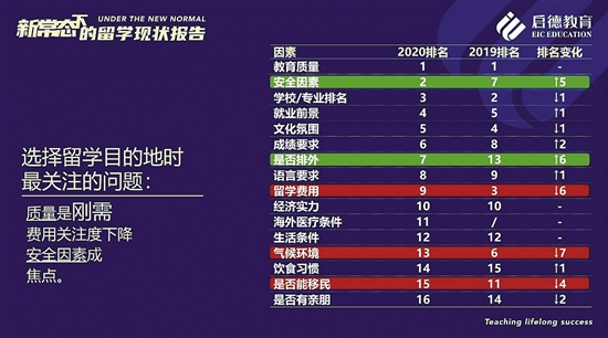 由于外部环境复杂,“安全因素”成为2020年中国学生在选择留学目的地时最为关心的因素之一(排名第二),仅次于“教育质量”(排名第一)。同时,“是否排外”也从2019年的第13位升至第7位。
