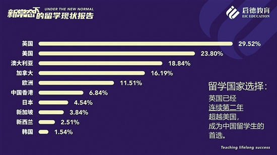 专业方面,商科与理工科仍为海外留学主要选择。《报告》显示,2019年赴澳读本科的学生中,商务/贸易(24.0%)专业选择人数占比最高,金融专业从2018年的第3位(6.5%)下滑到第10位(1.8%),管理专业(3.8%)和计算机科学专业(2.1%)则跻身前十。同时,2019年秋季入学加拿大的本科生中,选择理工科占比42%,商科占比37.1%,文科19.1%。2018/2019年度,赴美留学的中国内地学生选择最多的专业依次是:数学/计算机科学(19.9%)、商科和管理学(18.9%)、工程(18%)、社会科学(9.1%)、物理/生命科学(8.4%)。