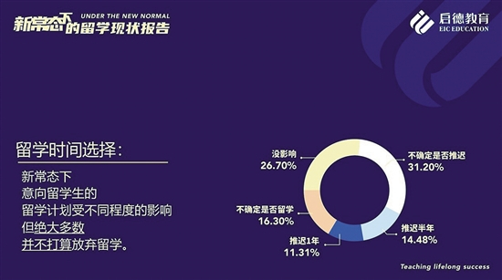 在疫情与国际环境叠加的“新常态”中,意向留学生的留学计划不同程度地受到影响,但大部分的意向留学生并不打算放弃留学,而主要是在时间规划上进行了调整。7月18日,启德教育发布的《新常态下的留学现状报告》(以下简称《报告》)显示,参与调研的意向留学生中,31.2%表示不确定是否推迟留学计划,26.7%表示没有影响,14.48%将留学计划推迟半年,11.31%将留学计划推迟一年, 16.3%表示不确定是否继续留学。