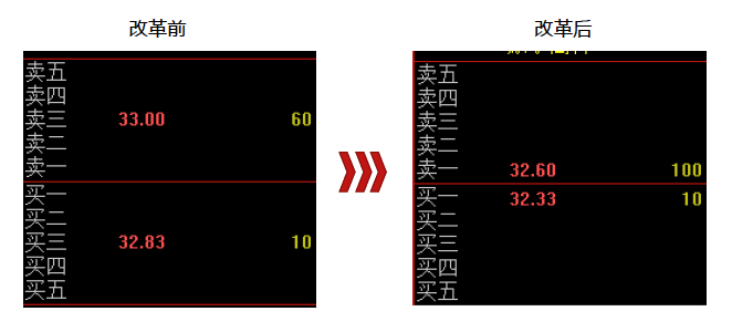 此次新三板改革前,如果没有集合竞价参考价,最优买价和最优卖价是揭示在买三和卖三的位置上。新三板改革后,在没有集合竞价参考价的行情揭示中,将最优价放在了买一、卖一的位置,更符合投资者的习惯。