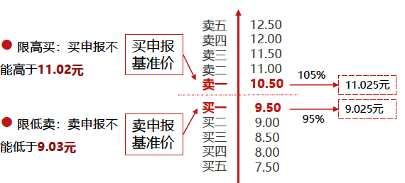 规则规定,买入价申报价格不高于买入基准价格的105%或买入基准价格以上10个最小价格变动单位(以孰高为准)。卖出申报价格不低于卖出基准价格的95%或卖出基准价格以下10个最小价格变动单位(以孰低为准)。