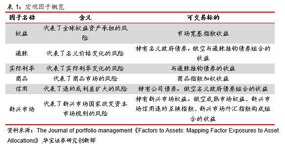 比如在《Factors to Assets: Mapping Factor Exposures to Asset Allocations》一文中定义了6个宏观因子权益、通胀、实际利率、商品、信用和新兴市场以及宏观因子对应的可交易标的,用以解释各类资产的收益,6个宏观因子的定义如下所示: