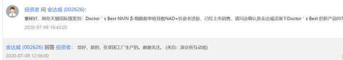 7月8日下午,有投资者在互动平台提问金达威,称在某电商平台搜索到Doctor's Best NMN β-烟酰胺单核苷酸NAD+抗衰老逆龄,已经上市销售,该产品是否为金达威旗下Doctor's Best 的新产品。7月9日,金达威董秘在回复中确认了此事,称产品是在美国工厂生产的。