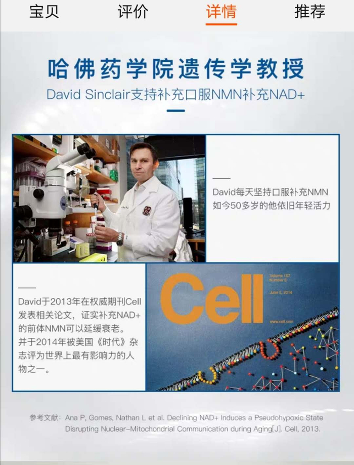 近期火热的NMN产品详情中特别提到了“哈佛药学院遗传学教授David Sinclair”,他支持口服NMN补充NAD+。澎湃新闻在哈佛大学查询到了该教授,而公开的资料显示,他是哈佛大学医学院遗传学系教授。