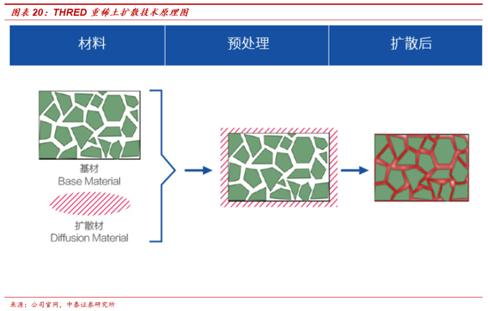 THRED重稀土扩散技术通过重稀土在晶间相的扩散,达到使用少量重稀土实现高矫顽力和高工作温度的目标,是经典扩散理论在钕铁硼生产上的创新性应用,是钕铁硼技术的又一革命性进步。