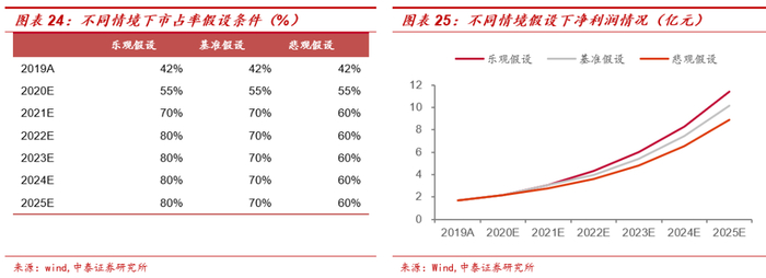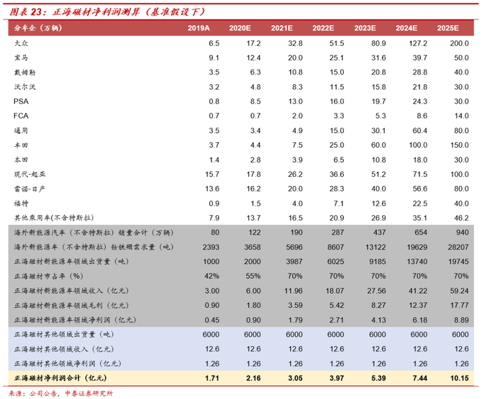 正海磁材已经进入到海外主流车企的核心供应链体系,19年正海磁材新能源车用钕铁硼出货量在1000吨左右,海外市场需求量约2393吨,据此测算,正海磁材海外市场市占率约为42%,随着海外主流车企的快速放量,尤其是欧洲车企的放量,公司全球市占率或将不断提升,我们分三种情形做讨论:乐观情境下假设公司2025年市占率提升至80%(不含特斯拉,下同),基准假设下市占率约为70%,悲观假设下市占率为60%。