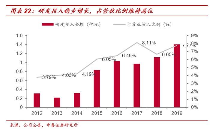 研发投入自2013年起稳步增长。公司一直以来坚持自主创新的发展道路,注重新技术的开发和研究,确保始终掌握前沿技术,增强自身核心竞争力。公司在高性能钕铁硼永磁材料产品的新技术、新工艺、新产品开发方面不断进取,上海大郡则在新能源汽车电机驱动系统的新技术储备、产品升级换代、新品开发等方面持续提升。研发投入自2013年起稳步增长,2018年更是突破新高达到11169.06万元。2015年起研发投入占营收比例均保持在6%以上,2019年占比为7.77%。