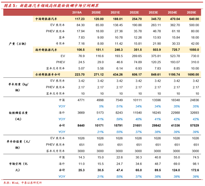 市场空间:新能源汽车用钕铁硼,2019-2025年近7倍增长,CAGR38%
