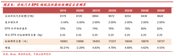 电动助力转向系统(EPS)以其高性能高稳定性,市场渗透率稳定提升。目前常见的有液压助力转向系统(HPS)、电控液压助力系统(EHPS)和电动助力转向系统(EPS),与HPS和EHPS相对比,EPS具有高稳定性,且系统反应灵敏、迅速,自动化程度高、油耗低等优势,在乘用汽车市场正在逐渐取代液压转向系统,市场渗透率稳定提升。根据智研咨询的数据,2018年我国EPS需求量为1850.8万套,全年汽车产量约为2780.9万辆,EPS市场渗透率为67%,海外市场EPS渗透率在80%以上,假定全球EPS市场渗透率稳定提升。考虑到疫情的影响,假设传统汽车销量2020年同比下滑5%,此后保持2%的稳定增速,单个EPS约消耗0.25kg钕铁硼磁材,据此测算传统汽车EPS对高性能钕铁硼的需求量将由2019年的10785吨提升至15645吨,CAGR为6.40%。