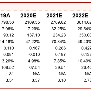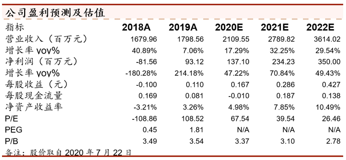 在上述假设条件下,我们预计公司2020/2021/2022年归母净利润分别为1.37/2.34/3.50亿元,对应EPS分别为0.17/0.29/0.43元,目前股价对应的PE估值水平则分别为68X/40X/27X。公司22年的估值水平明显低于新能源汽车产业链龙头企业估值,当前市值水平也并未充分反映公司的中期成长空间,维持“买入”评级。