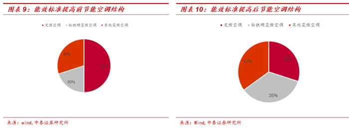 地产后周期带动销量回升+能效标准提高,家电产品边际改善。1)假设受疫情影响,2020年家电销量同比下滑5%,地产后周期,随着地产竣工的加速,预计2021年空调恢复增长,2022年起维持每年2%增速;2)2020年7月1日起,空调将实行新的能效标准,新标准1级能效指标对标国际,已达到国际领先水平,变频空调能效准入要求(3级)基本与欧盟、美国等的准入要求相当。受益能效标准提高,空调及空调用钕铁硼将出现结构性增长——定频和变频都有1-5级别,但是定频的能效标准普遍偏低,当前定频与变频市场各占据50%,强制提能效标准提升之后,相对低能效的要淘汰,定频需要用变频来替代,预估变频市场占比将提升至70%,钕铁硼渗透率也会由当前40%提升到50%+,也就是钕铁在空调领域的应用将出现结构性增长(20%→35%+)。