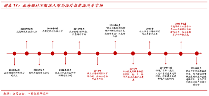 2、新能源汽车产品,尤其是海外市场进入壁垒高,公司竞争优势明显。新能源车用高性能钕铁硼磁材行业在制造工艺、客户认证、资金以及专利等四个方面拥有较高的行业壁垒,尤其对于海外市场,行业竞争一片蓝海。2013年公司获得海外专利后,便在欧洲、北美、日韩等地区深入布局,并依托正海无氧工艺理论、TOPS细晶技术、THRED重稀土扩散技术三大核心技术,已然进入海外主流新能源车企供应链体系。