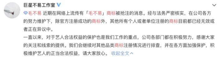 7月22日,毛不易工作室微博@巨星不易工作室回应,近期在网络上流传有“毛不易”商标被抢注的消息。经与法务严密核实,在公司各方的努力维护下,除官方注册成功的商标外,其他所有个人或者单位注册的商标目前都已经无效或者正在异议中。