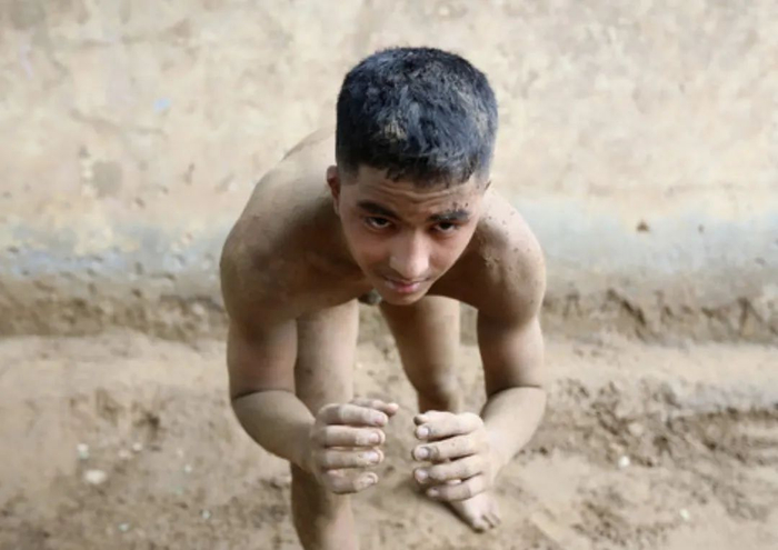 6月29日,一名学员在印度新德里郊外摔跤学校的泥地上练习传统摔跤。新华社/欧新