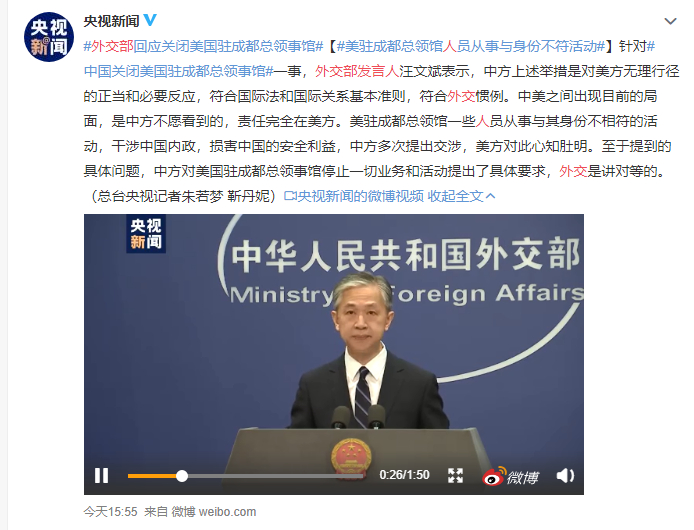 针对中国关闭美国驻成都总领事馆一事,外交部发言人汪文斌表示,美驻成都总领馆一些人员从事与其身份不相符的活动,干涉中国内政,损害中国的安全利益,中方多次提出交涉,美方对此心知肚明。至于提到的具体问题,中方对美国驻成都总领事馆停止一切业务和活动提出了具体要求,外交是讲对等的。