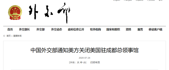 据外交部网站消息,2020年7月24日上午,中国外交部通知美国驻华使馆,中方决定撤销对美国驻成都总领事馆的设立和运行许可,并对该总领事馆停止一切业务和活动提出具体要求。