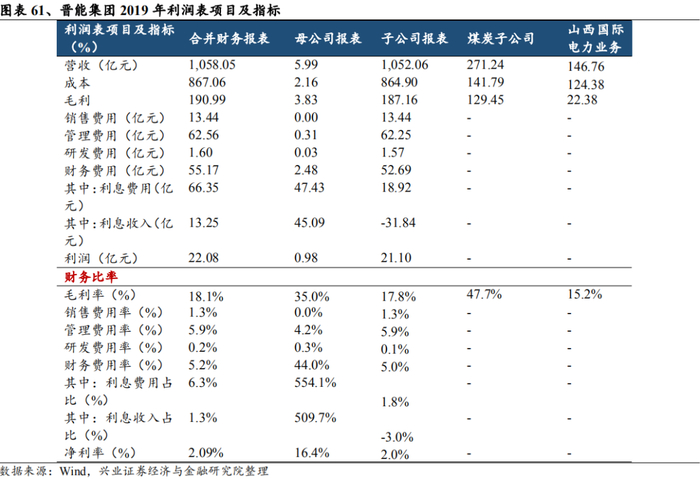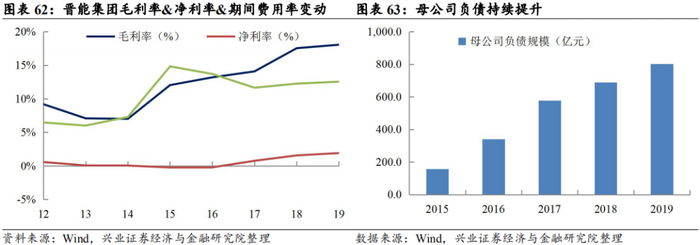 母公司承担了集团主要的融资职责,财务费用高企。2019年,晋能集团毛利率18.1%,其中母公司毛利率达到35.0%,但由于母公司层面业务极少,对盈利贡献很少。但同时,母公司三费占比高达48.5%,远高于子公司的11%;具体来看,母公司管理费用率、销售费用率分别为4.2%、0.3%,低于集团整体水平,母公司层面并没有太多的人员负担;母公司财务费用2.48亿元,其中利息费用为47.43亿元,利息收入为45.09亿元,财务费用率高达44.0%,这主要由于母公司作为集团最主要的融资主体,承担了较多带息债务;近几年,对外融资的利息费用高于对子公司借款的利息收入,导致了母公司财务费用的高企。