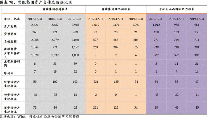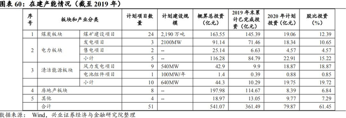 晋能集团经营性资产占比高,在建项目中电力项目占比高。截至2019年,晋能集团资产规模接近3000亿元,主要集中于经营性资产(固定资产+存货+在建工程+无形资产)。从增量来看,最主要的增量来自于固定资产(包括在建工程)、无形资产,其中既包括了新产能的投放、在建项目的推进,也包括了无形资产的重估(约170亿元)。值得注意的是,在建工程主要包括了风电、光伏、太阳能、煤电等重大发电项目,电力业务未来将继续占用集团较多的资金。