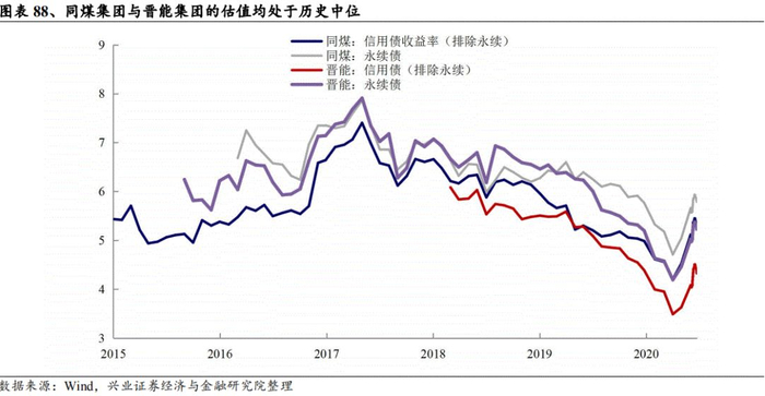 投资建议:1、两个公司资质不同,在定价上有一定的反映,市场定价相对理性。2、从估值分位来看,晋能与同煤目前依然有较好的持有价值。3、晋能永续债存在一定的超额价值,而同煤中短期违约风险不大,短期价值仍可以,风险偏好较高的投资者可以适度参与。