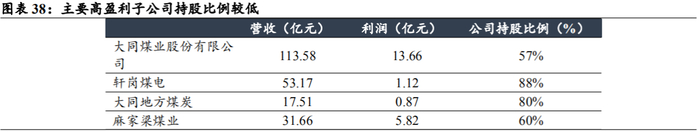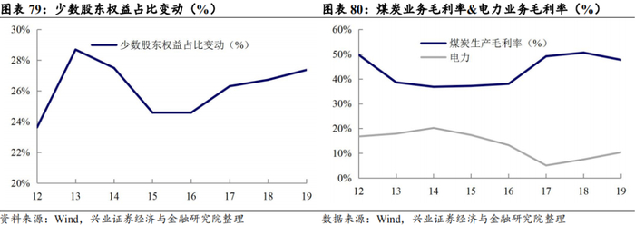 c) 最重要的原因在于高盈利的煤炭业务子公司持股比例较低。公司的利润主要由煤炭业务贡献,电力与新能源业务贡献比例很小。由于公司的煤矿业务主要通过不断整合而成,主要分散在十几家子公司,持股比例不高;而盈利较差的新能源与电力业务,主要由集团投资建设扩产,持股比例相对高,这导致了在利润分配上,集团股东分配的利润额度较少。
