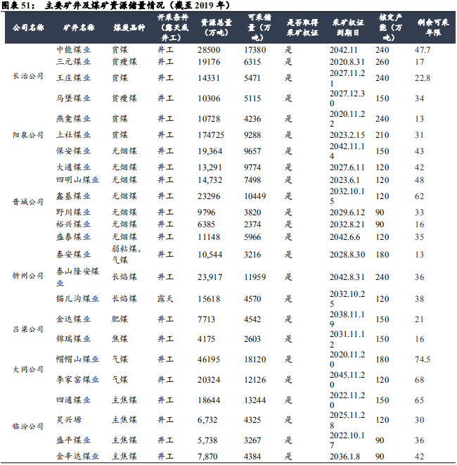 公司煤种齐全,煤炭可采储量超过27亿吨,煤矿可采年限长。从煤种来看,晋能集团煤种齐全拥有中国煤炭分类国家标准(GB5751-86)中的14类,包括无烟煤、贫煤、气煤、主焦煤等售价较高的煤种,煤炭业务毛利润在7家煤炭企业中排名靠前。从储量来看,截至2019年末,晋能集团拥有152座矿井,井田面积合计1293平方公里,地质储量118亿吨。从产量来看,随着整合矿井改扩建的推进,晋能集团煤炭产能大幅增长,2019年,煤炭产量为7,447万吨,较2018年同比增长11.33%。从在产产能来看,晋能集团在产产能7950万吨/年,并且主要煤矿较为年轻,可采年限长,在生产矿井平均可采年限36.6年,年产400吨以上的煤矿的可采年限均不低于50年;并且,2019年产量超过1.64亿吨,产能利用率超过100%。从在建产能来看,帽帽山、锦瑞、大通、四明山、鑫基、铂龙等6个矿井将总计扩充产能2010万吨。总的来看,公司目前产能处于扩产期,资源较为充沛。