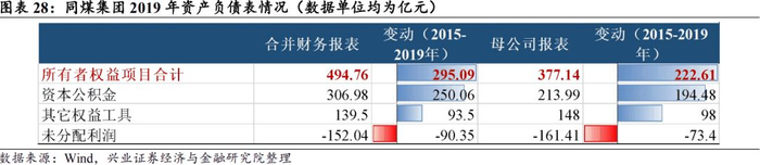 同煤集团主要依靠外部融资补充权益资本。截至2019年,同煤集团所有者权益接近500亿元,5年间增长300亿元;从结构来看,由于多年的亏损,同煤集团的未分配利润存量为-152亿元,在5年间累计亏损90亿元。集团在亏损的情况下,永续债(其他权益工具)来补充权益资本,即集团维持所有者权益增长的主要方式本质上依然为债务性融资。另外,2017年,公司对采矿权进行重估,调增无形资产采矿权超过200亿元,同时调增资本公积283亿元,对所有者权益有所调增,降低了资产负债率。