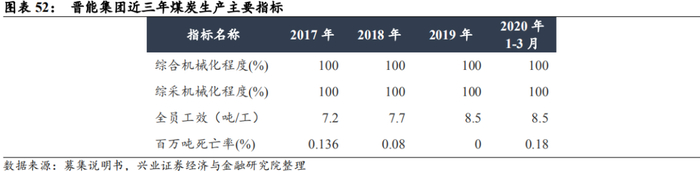 煤炭生产业务得益于高机械化水平和安全生产能力,成本逐年下降。原煤生产成本方面,2017年至2019年分别为174元/吨、128元/吨、123元/吨,呈逐年下降趋势。煤炭开采技术方面,公司利用资源整合的契机,对原有矿井和新并购矿井进行技术改造提升矿井的综合机械化水平。近年来,公司综合机械化程度和综采机械化程度持续上升,截至2020年3月底,以上两项指标均为100%。安全生产方面,2019年晋能集团百万吨死亡率为0%,较2018年0.083%进一步下降。2019年,公司未发生超过三人死亡的较大事故。