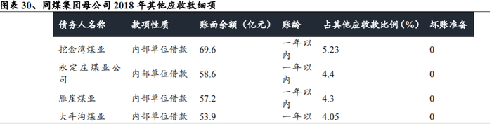 母公司资金通过其他应收款项目对子公司输血,部分子公司可能存在回收难问题。从负债端和权益端可以看到,母公司在集团中主要承担融资职责,盈利多年亏损。2015年至2019年间,资产端增长1235亿元,主要的增量资产项目为其他应收款,去向主要为内部单位借款。从回收来看,雁崖、大斗沟煤业(借款合计111亿元)受到较严重的去产能,2018至今并未有煤炭产出,资金或存在回收风险,而挖金湾、永定庄、王村煤矿依然处于扩产期,回收风险较小。