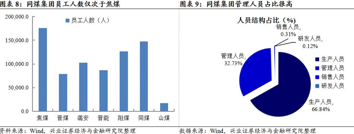 人员负担极大。从三费占比来看,2019年,同煤集团的三费占比合计5.68%,其中母公司三费占比达到22.6%,在七家山西煤企中负担最重。并且,同煤集团员工数量达到14.7万人,七家山西煤企中仅低于焦煤集团,管理人员数量占比达到32.73%。